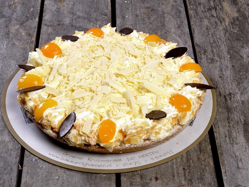Heerlijke zanddeeg bodem gevuld met abrikozen bavaroise abrikozen slagroom en witte chocolade.