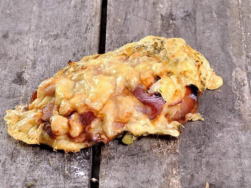 Met Spelt, Tarwe en rogge.Verrijkt met spekdobbelsteentjes,ui en gepraspte kaas