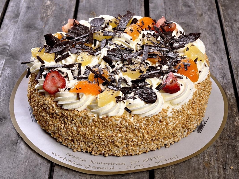 Zacht biscuitbeslag, gevuld met slagroom en manadrijtjes. Royaal gegarneerd met slagroom